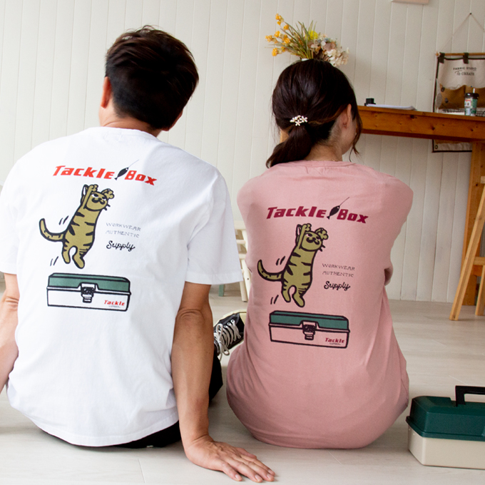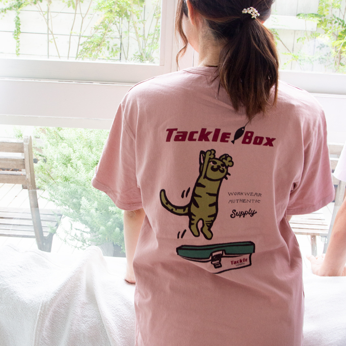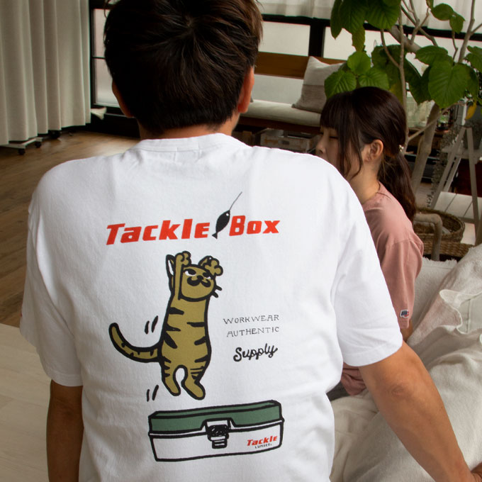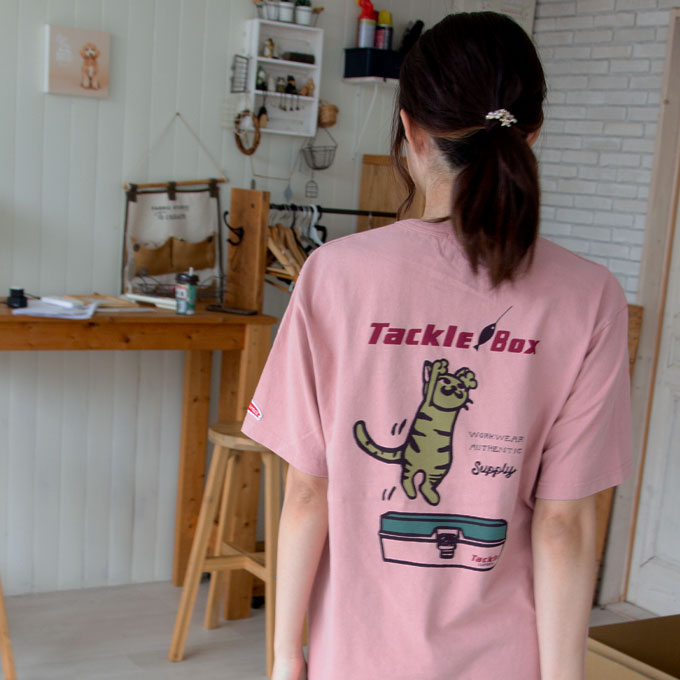 バックプリントには、釣りのルアーに飛びつくネコとタックルボックスを