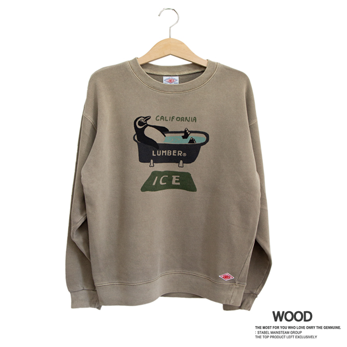 ランバーのプリントに馴染ませる為に作られた後染めクルーネックスウェット。古着のような製品染め風合いが雰囲気のある一枚に仕上がっております。