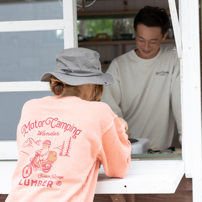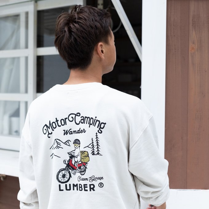 ランバーのプリントに馴染ませる為に作られた後染めクルーネックスウェット。古着のような製品染め風合いが雰囲気のある一枚に仕上がっております。